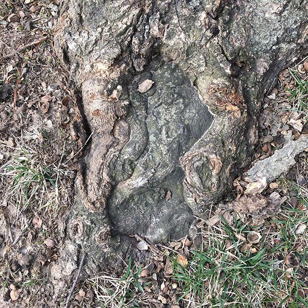 These pictures show repeated mower damage to surface roots and flare zone damage from mowers and/or string-trimmers.