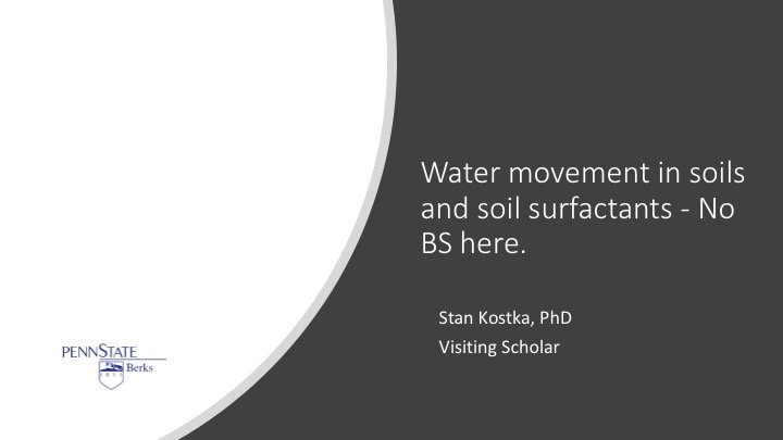 Stan Kostka, Ph.D., a visiting scholar at the Penn State-Berks campus, focuses on water behavior in diverse soils; the concepts of water movement as influenced by soil physical, chemical or biological properties, including water repellency; recent advancements relating to interfaces; and the boundaries between soil textural classes, soil particles, microorganisms, organic matter and plant roots.