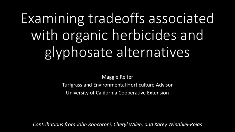 The presenter gives detailed information on organic vs. conventional herbicide options and methods to improve efficacy of organic herbicides and other alternatives to glyphosate-containing products like solarization and lethal steam. Research results are presented from trials conducted at the University of California.