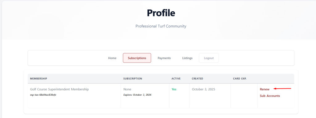 You’ll see your membership history. Find your expired membership and click the Renew button.